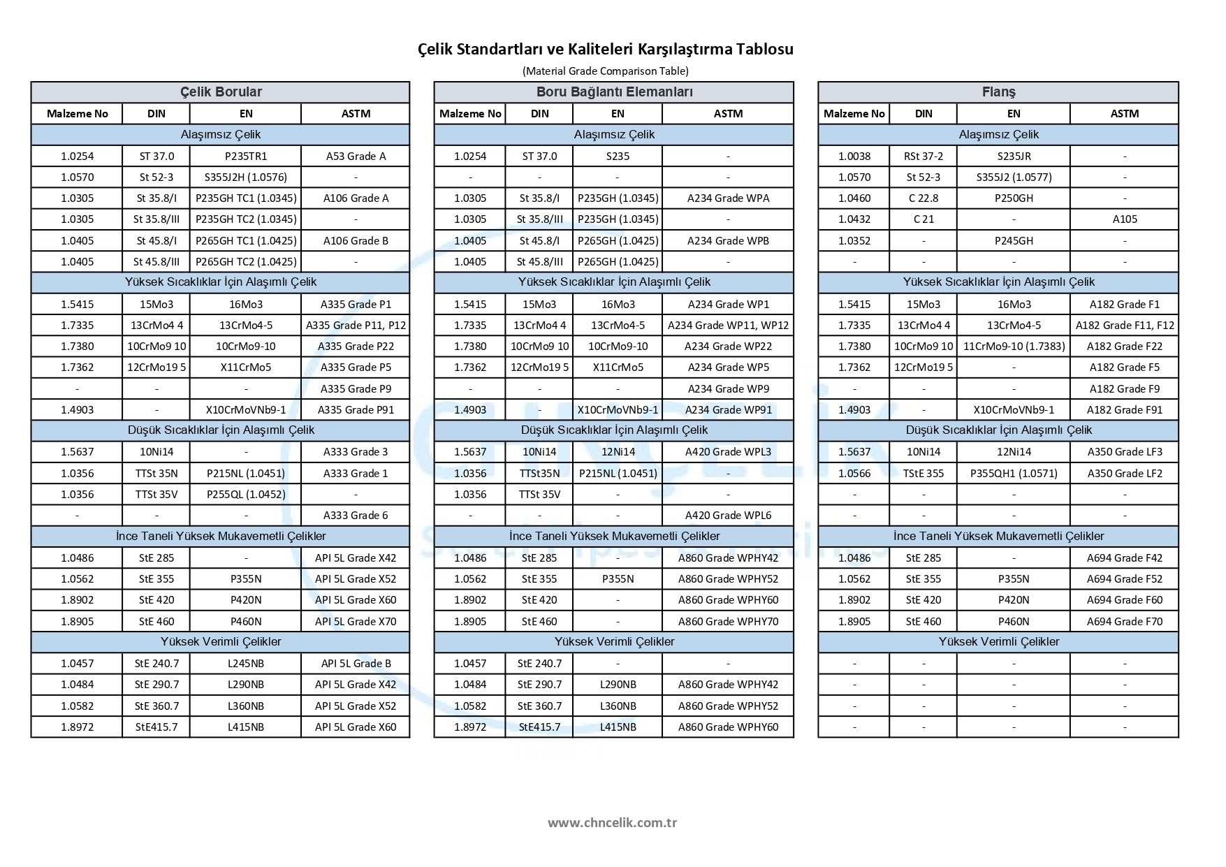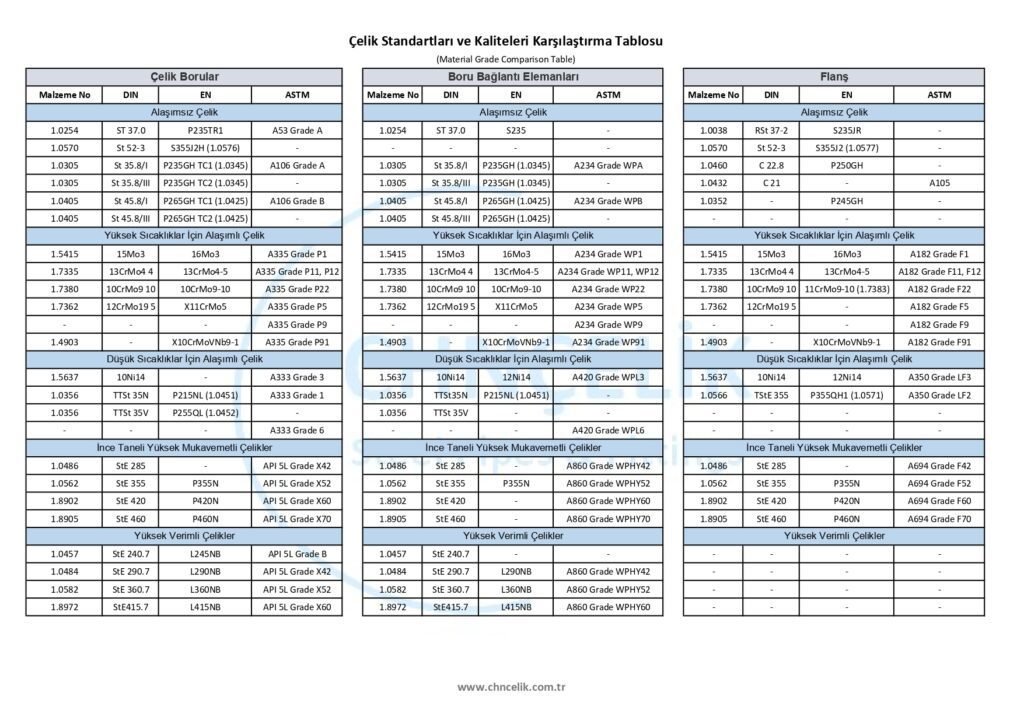 Çelik Standartları ve Kaliteleri Karşılaştırma Tablosu